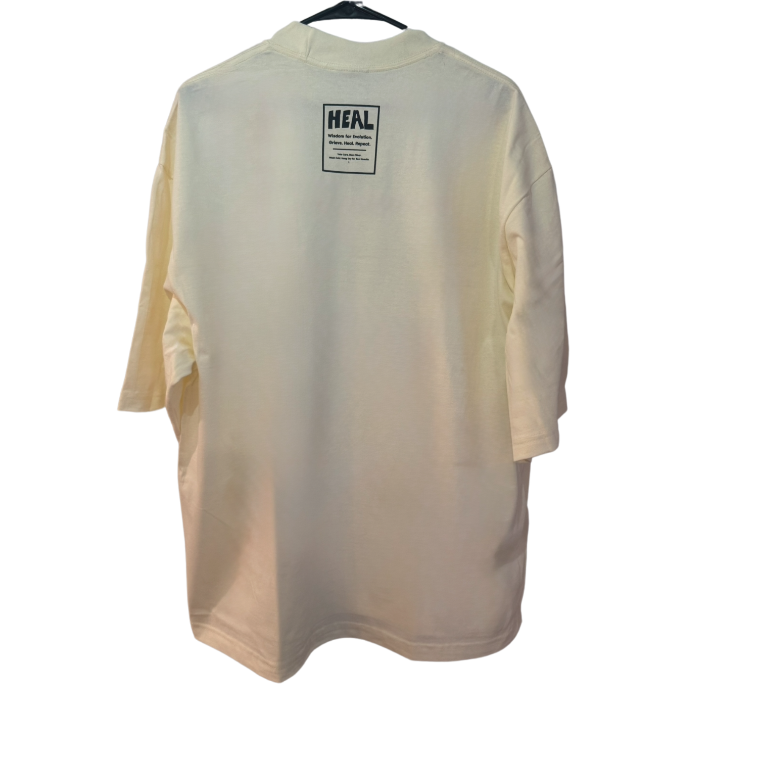 HEAL uniquely shows a tag and message on the back of the shirt. The intention is to promote healing, take away stigmas about size and judgement, share wisdom, and provide tips to reduce waste. "Wisdom for Evolution. Grieve. Heal. Repeat. Take Care. More Wear. Wash Cold. Hang Dry for Best Results." We hope you see the vision.